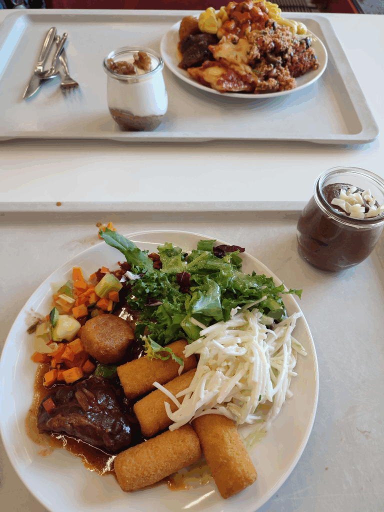 A heidelbergi menzákon nagyon jó volt, hogy habár vannak egyben kapott adagok is, opció a svédasztalos szedés is. A Triplex Mensán és az INF Mensán lehetett tényleg nagyon olcsón kapni egy adag kaját, utóbbin volt mindennap egy vegán és egy hús opció is. A Marstall Mensa és az INF Mensa viszont svédasztallal is dolgozott: mindenből annyit szedtünk, amennyit akartunk, és ezt lemérték, aztán súlyra fizettünk. Nekem ez általában 5 euró körülre jött ki egy normál érkezésnél, de aki többet eszik, annak inkább 7-8 euró körül lehet.